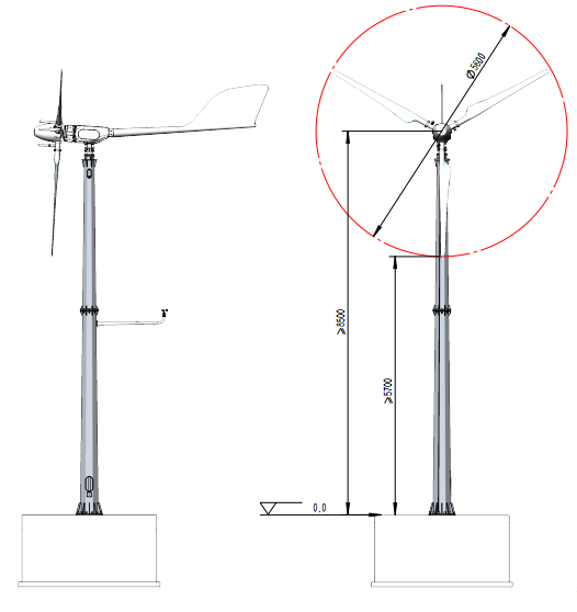 風(fēng)輪直徑:5.6m 葉片數(shù)量及材質(zhì):3*增強(qiáng)型玻璃鋼