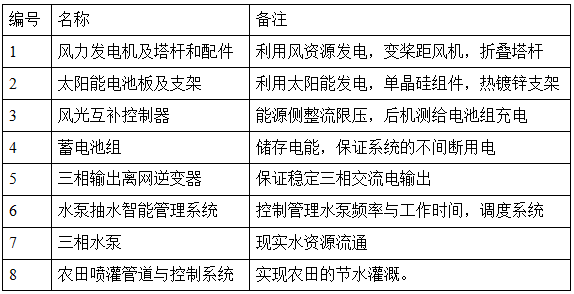 基于以上背景材料,青島安華新元風(fēng)能股份有限公司從企業(yè)的社會(huì)責(zé)任感出發(fā),結(jié)合企業(yè)自身質(zhì)量過硬的產(chǎn)品、領(lǐng)先的技術(shù)創(chuàng)新能力等特點(diǎn),先天下之憂而憂,積極投身于新能源產(chǎn)品應(yīng)用于農(nóng)田水利灌溉的研究課題,創(chuàng)造性的提出了風(fēng)光互補(bǔ)提水智能灌溉的新型農(nóng)田灌溉系統(tǒng)。這套系統(tǒng)創(chuàng)新性的融入能源電力供應(yīng),大高度差提水,智能噴灌、滴灌,智能系統(tǒng)管理等特點(diǎn),為全國(guó)的新型農(nóng)業(yè)灌溉提供了一套完整的解決方案。 該系統(tǒng)主要配置如下: