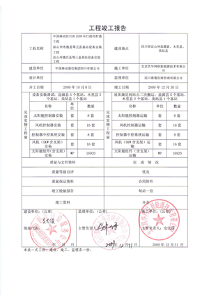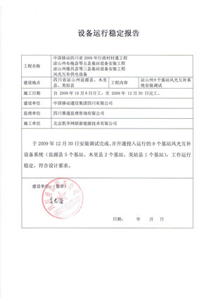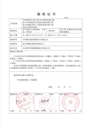 我司于2009年下半年在四川省陸續(xù)為中國(guó)移動(dòng)通信基站(甘孜州30多個(gè)基站、涼山州30多個(gè)基站)安裝了100多套5kW變槳距風(fēng)力發(fā)電機(jī),憑借穩(wěn)定的供電能力、惡劣環(huán)境下免維護(hù)高負(fù)荷運(yùn)行能力以及整機(jī)零質(zhì)量問(wèn)題的突出表現(xiàn),得到了中國(guó)移動(dòng)通信集團(tuán)四川有限公司的高度認(rèn)可并順利通過(guò)驗(yàn)收。