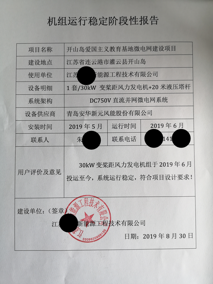 2019年8月30日,風力機組順利通過業(yè)主的階段性驗收,這是對青島安華新元風電直流發(fā)電系統(tǒng)性能和服務的充分認可。